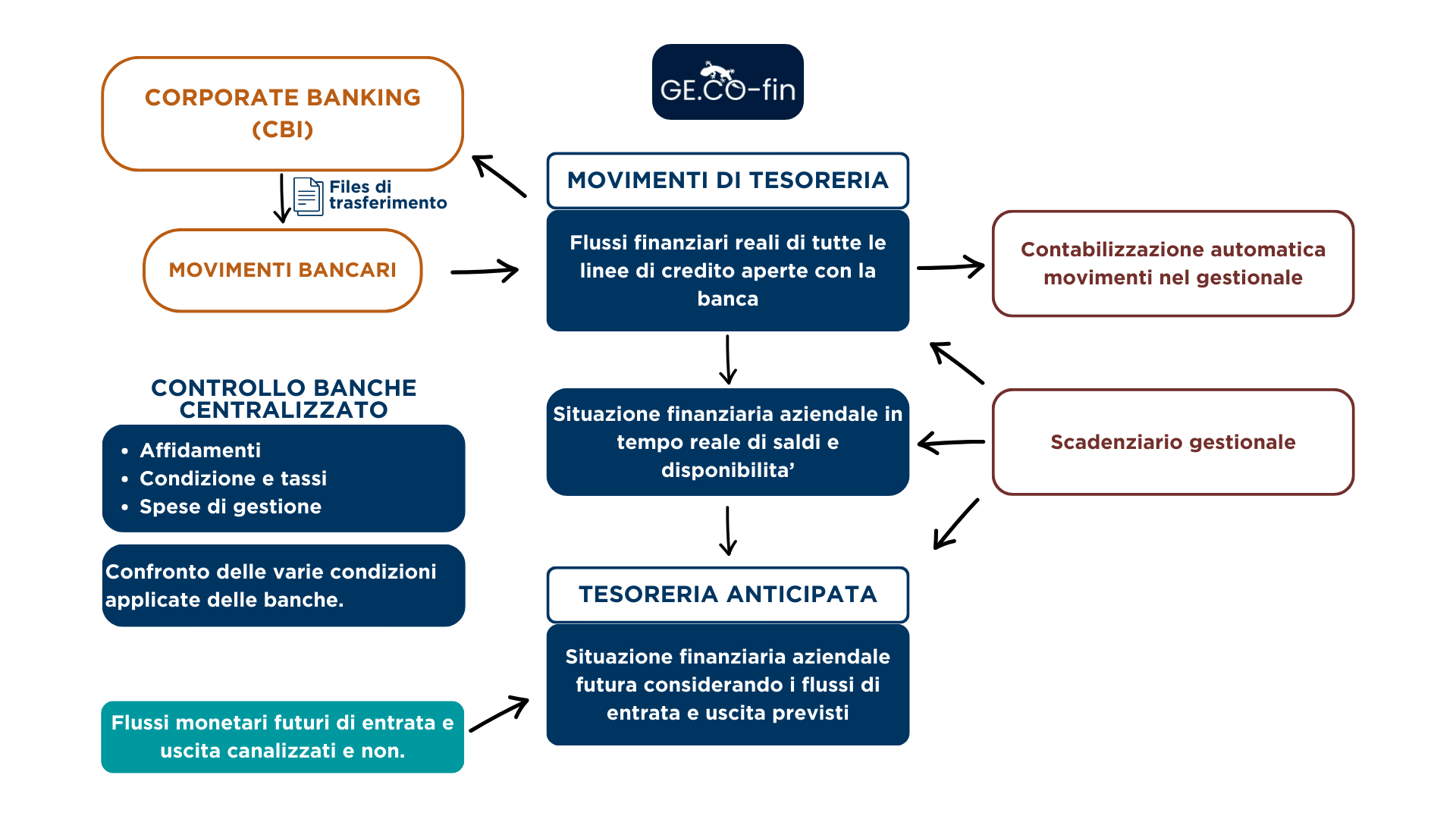 Inserimento delle operazioni bancarie per la gestione e il controllo anticipato del flusso monetario aziendale, flusso di cassa e di ogni altro rapporto bancario.